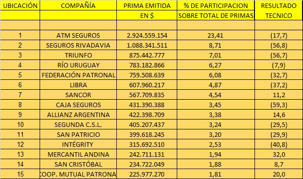 ATM es la aseguradora que lidera el ranking, con una producción de $ 2.924.559.154 y una participación en el segmento del 23,41 % . Ocupan del segundo al quinto puesto Seguros Rivadavia ($ 1.088.341.511 y 8,71%), Triunfo Seguros ($ 875.442.777, 7,01 %) ,Río Uruguay Seguros ($ 783.182.866 , 6,27 %) y Federación Patronal ($759.508.639, 6,08%).