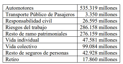 La distribución acumulada de las mismas es la siguiente: Automotores 535.319 millones Transporte Público de Pasajeros 3.350 millones Responsabilidad civil 26.595 millones Riesgos del trabajo 286.158 millones Resto de ramo patrimoniales 276.159 millones Vida individual 47.581 millones Vida colectivo 99.084 millones Resto de seguros de personas 42.928 millones Retiro 17.860 millones.