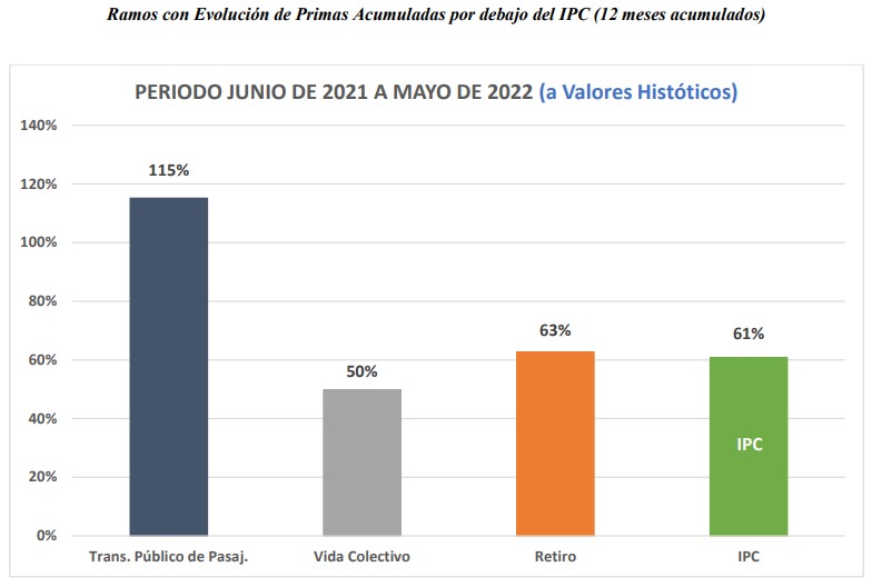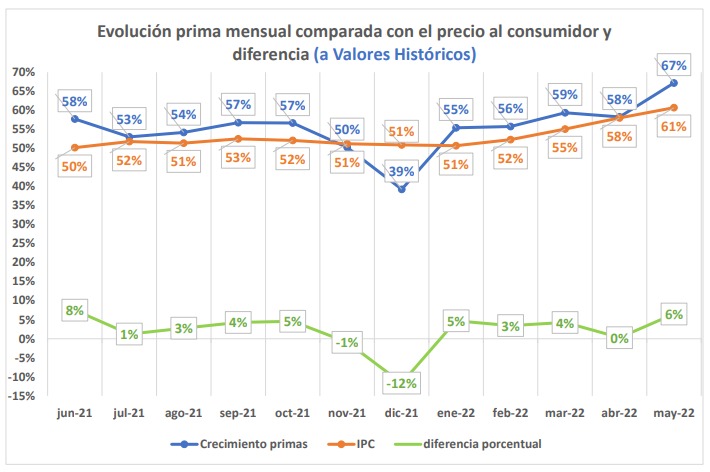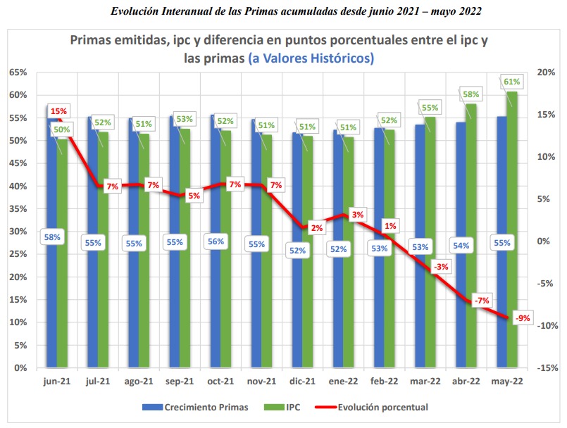 El Índice de Precios al Consumidor de los últimos doce meses en la República Argentina a mayo de 2022 creció el 60,7 % y para la misma fecha las primas acumuladas durante el período junio 2021-mayo 2022 aumentó un 55,2 %; que representan 5,5 puntos básicos por debajo y 9 % por debajo de la inflación.