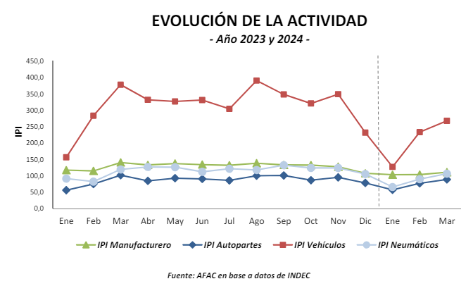 La producción de vehículos disminuyó durante el primer trimestre de 2024 un 23,2% respecto al mismo periodo de 2023, cerrando el periodo con 103.293 unidades fabricadas. Al comparar el mes de marzo contra febrero de 2024 se verifica un aumento de 15,1%, mientras que si se lo compara con el mismo mes de 2023, se registra una caída de 29,4%.