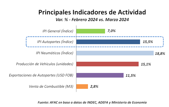 Las exportaciones de autopartes, en tanto, registraron, un aumento de 2,3% interanual durante el periodo enero‐marzo de 2024, y al comparar marzo con febrero de 2024 el incremento fue de 11,5%.