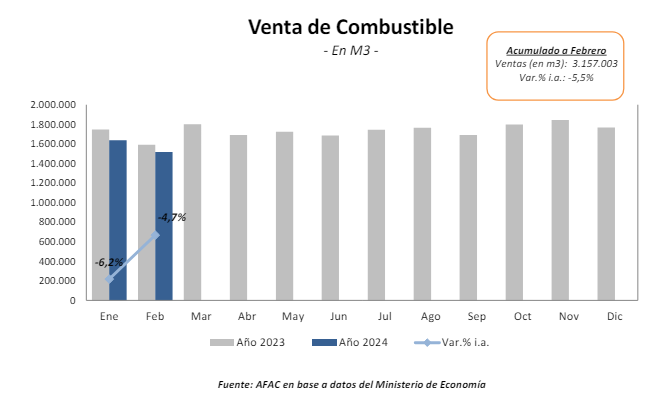 Para el segmento de mercado de reposición, al considerar la venta de combustible como un indicador aproximado del nivel de actividad del mismo, se observó una caída para enerofebrero que se ubicó en 5,5% interanual.