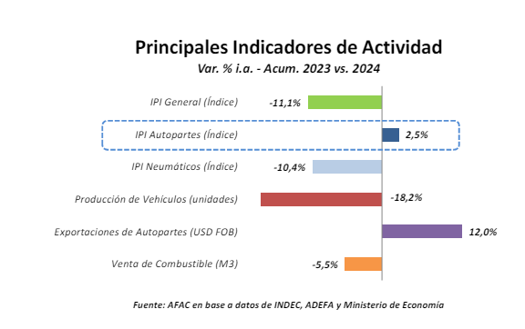 El sector autopartista presentó durante el primer bimestre de 2024 un aumento en su nivel de actividad de 2,5% respecto al mismo periodo de 2023. Al comparar el mes de febrero de 2024 con el mismo mes de 2023, se verifica un incremento de 2,9%, y al compáralo con enero de 2024 el incremento fue de 34,6%. Todos los rubros vinculados a la Cadena de Valor Automotriz presentaron aumentos durante los dos primeros meses del año, a excepción de la venta de combustible que sufrió una caída de 7,3% respecto al mes anterior y un 5,5% i.a. en el acumulado.