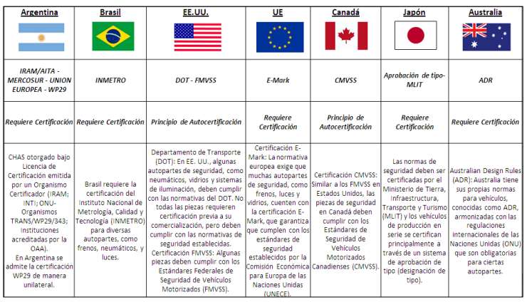 Cumplimiento de la Ley: en muchos países desarrollados, las normas exigen que todos los vehículos y sus componentes críticos cumplan con ciertas normas de seguridad, con certificaciones previas a ser comercializados. El incumplimiento de estas normativas puede llevar a sanciones, retiros de productos y contingencias legales y económicas. A modo de ejemplo, en el siguiente cuadro se presentan algunos casos de países en los cuales las autopartes de seguridad deben cumplimentar con normas técnicas: