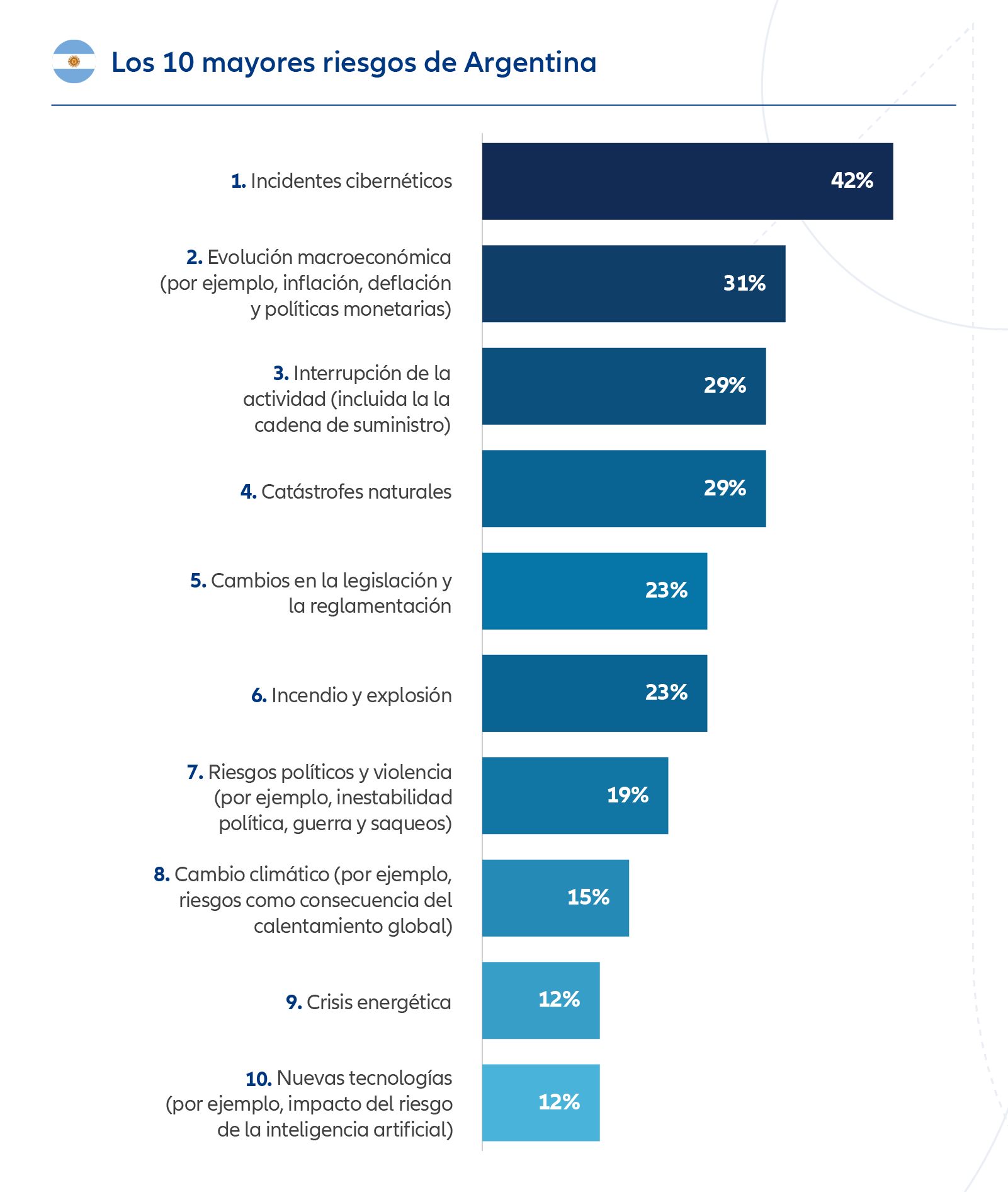Este 2025 las empresas argentinas encuestadas han determinado los incidentes cibernéticos - como los cibercrímenes, problemas informáticos y riesgos de violación de datos - como su mayor preocupación. Este riesgo consta con una amplia ventaja de once puntos sobre la segunda preocupación más relevante: la macroeconomía. Mientras la inquietud con los asuntos digitales es mencionada por el 42% de los directivos, la evolución de la economía le sigue en el ranking con un 31%.