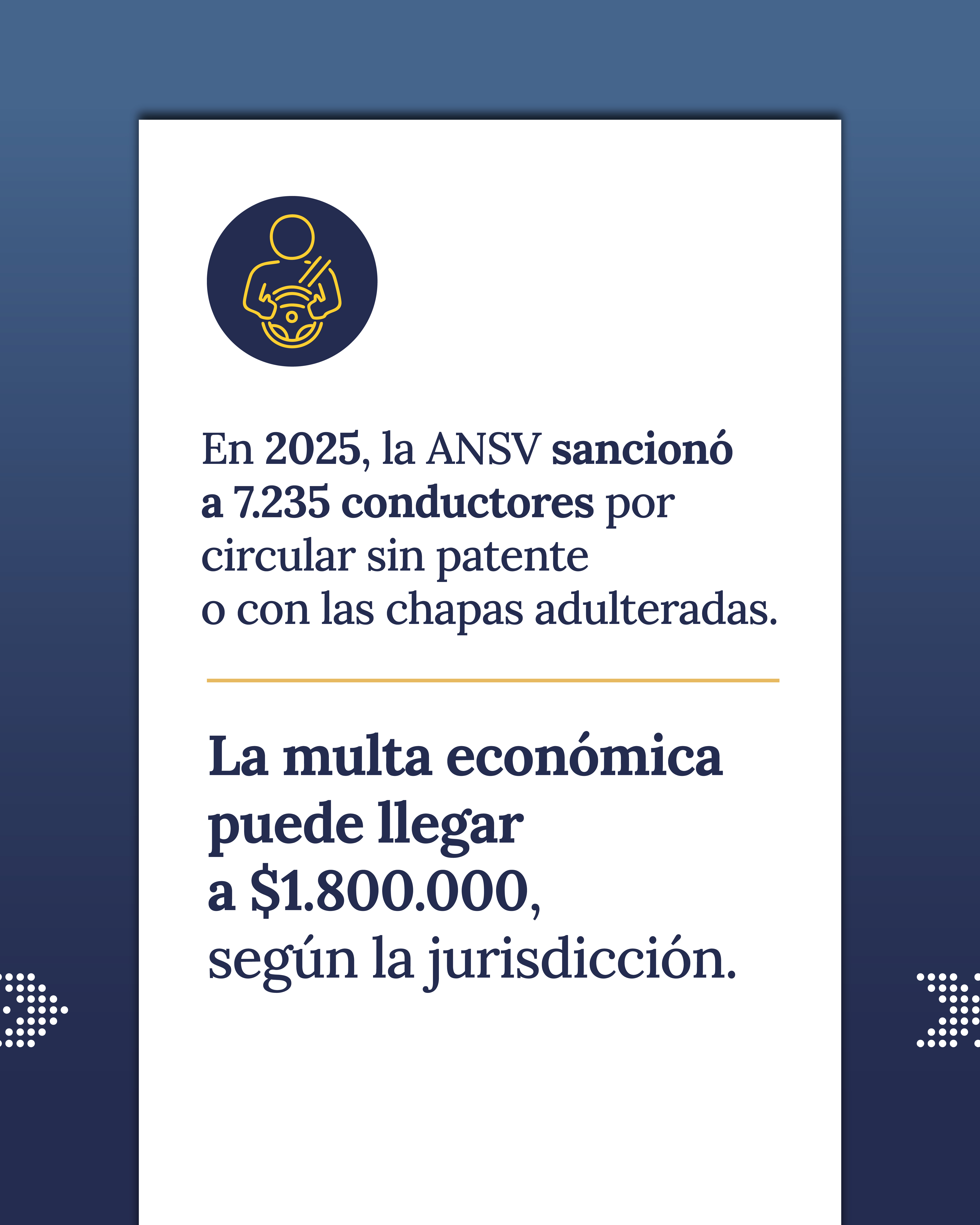 En 2025, la Agencia Nacional de Seguridad Vial (ANSV) detectó y sancionó a 7.235 conductores que circulaban sin patente o con las chapas adulteradas en rutas y autopistas. Ante esta situación, el organismo remarca que la patente debe estar colocada de forma visible y cumplir con las características establecidas por la Dirección Nacional de los Registros Nacionales de la Propiedad Automotor y de Créditos Prendarios (DNRPA).