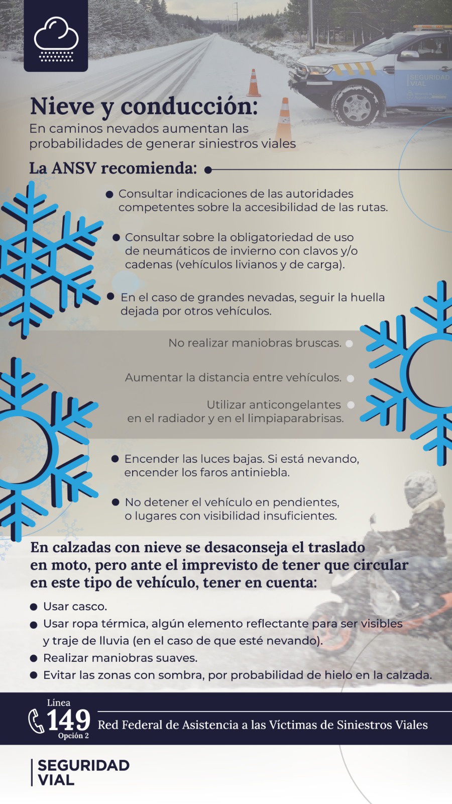 Las nevadas en varias provincias del país provocan que muchas rutas presenten baja adherencia por la presencia de nieve, hielo y/o barro sobre la calzada. Por esta situación, los conductores deben extremar las precauciones al circular para evitar incidentes.