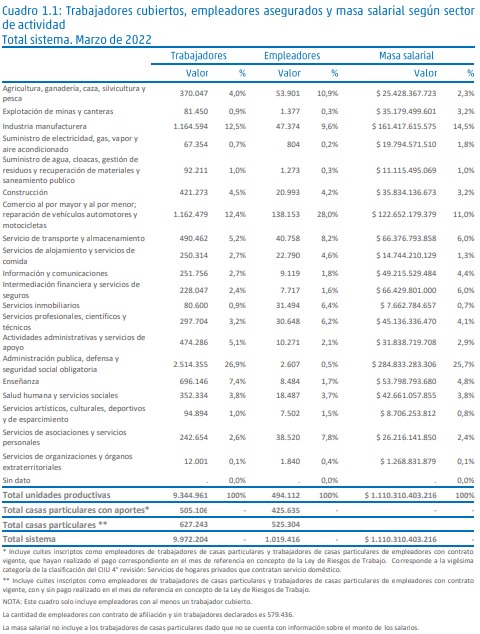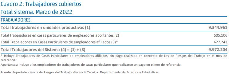 En Marzo de 2022, el Sistema de Riesgos del Trabajo registraba un total de 1.598.852 empleadores asegurados con al menos un trabajador declarado. Dicha cifra es un 0,,58 % superior a la registrada en el mes de Febrero de 2022. A su vez, el Sistema cubría un total de 9.972.204 trabajadores, (un 0, 22 % superior al mes pasado)de los cuáles 9.344.961 desarrollaban sus tareas en unidades productivas, ( + 0,26 % ) y 627.243 en casas particulares (DPEN 467/2014 / Resolución SRT 2224/14). (- 0,33 %) Por unidades productivas se entiende a entidades, empresas u organismos públicos o privados, que reúnen a uno o más trabajadores, y que producen bienes o servicios.