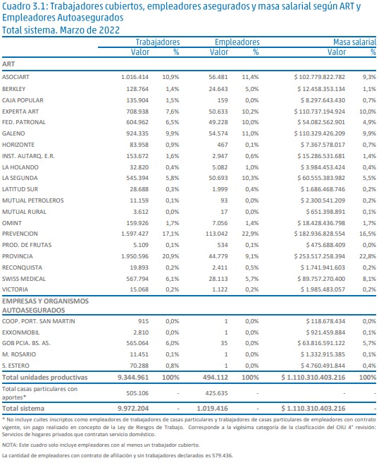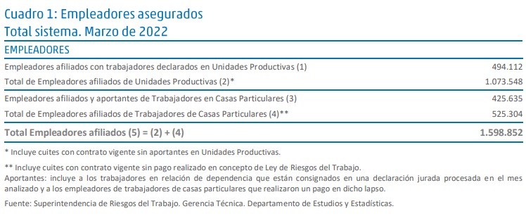 En Marzo de 2022, el Sistema de Riesgos del Trabajo registraba un total de 1.598.852 empleadores asegurados con al menos un trabajador declarado. Dicha cifra es un 0,,58 % superior a la registrada en el mes de Febrero de 2022