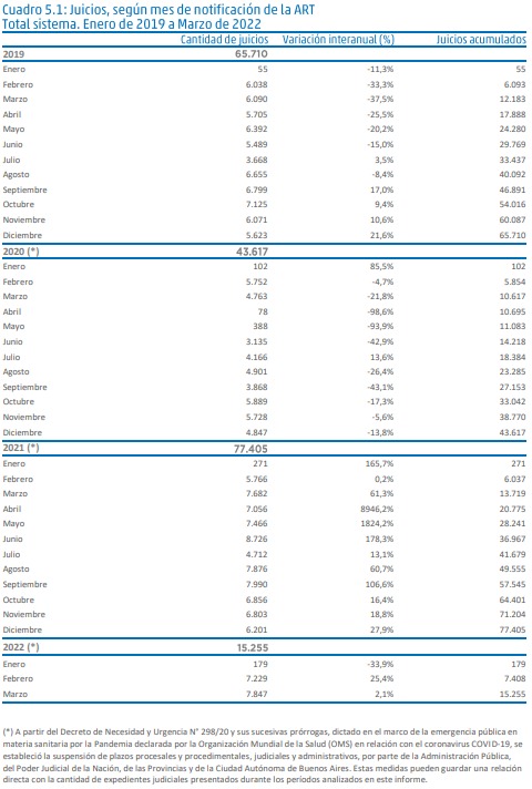 En lo que respecta a los juicios notificados en el mes de Marzo la cifra fue de 7847 casos, lo que constituye una variación internaual del 2,1 % , acumulando un total de 15.255 casos en lo que va del primer trimestre de 2022