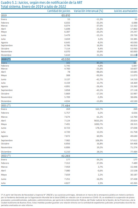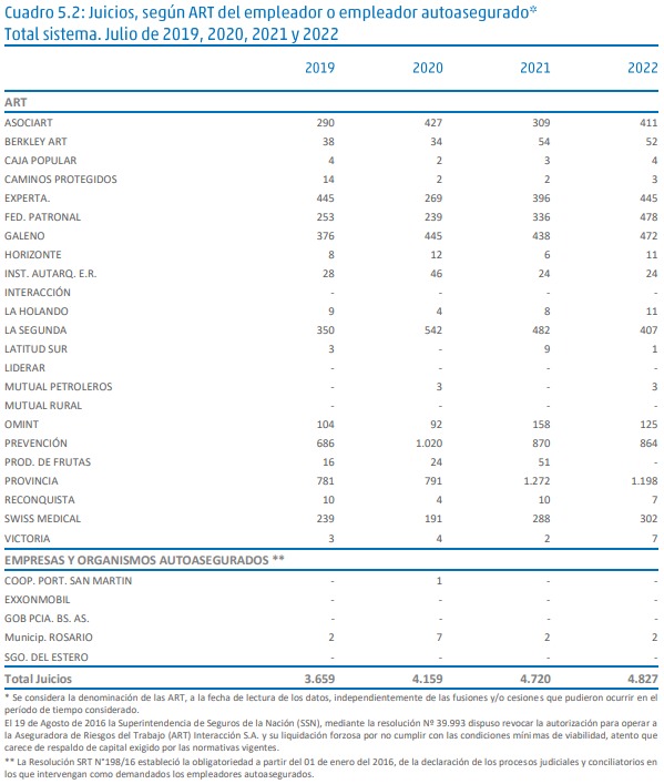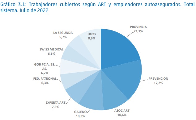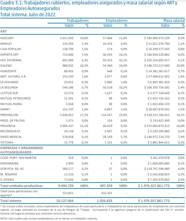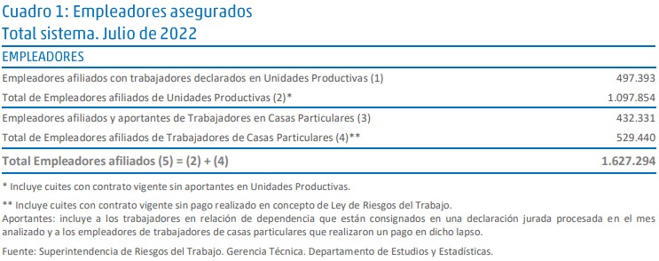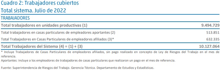 En Julio de 2022, el Sistema de Riesgos del Trabajo registraba un total de 1.627.294 empleadores asegurados con al menos un trabajador declarado. Dicha cifra es un 0,50 % superior al registrado en el mes de Junio de 2022. A su vez, el Sistema cubría un total de 10.127.064 trabajadores (un 0,75 % superior al mes pasado), de los cuáles 9.494.729 desarrollaban sus tareas en unidades productivas, (+0,79 %) y 632.335 en casas particulares (+0,2 %) (DPEN 467/2014 / Resolución SRT 2224/14) .Por unidades productivas se entiende a entidades, empresas u organismos públicos o privados, que reúnen a uno o más trabajadores, y que producen bienes o servicios.
