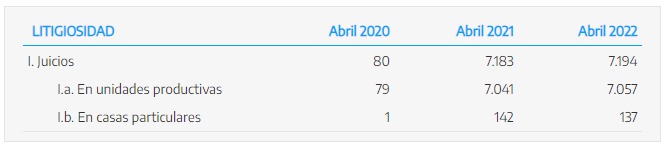 Del mismo se desprende que la cantidad de juicios notificados en ABRIL 2022 fue de 7194 casos, de los cuales 7057 corresponden a unidades productivas y 137 a casas particulares.