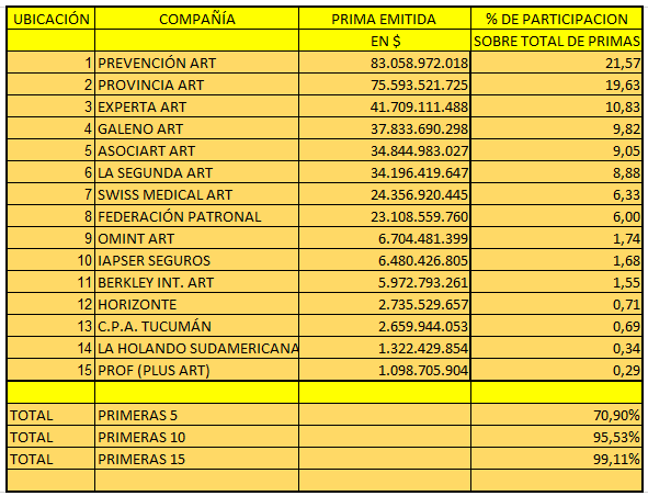 PREVENCIÓN ART es la aseguradora que lidera el ranking, con una producción de $ 83.058.972.018 y una participación en el segmento del 21,57 %. Ocupan del segundo al quinto puesto PROVINCIA ART ($ 75.593.521.725 y 19,63 %), EXPERTA ART ($ 41.709.111.488 y 10,83 %), GALENO ART ($ 37.833.690.298 y 9,82 %) Y ASOCIART ART ($ 34.844.983.027 y 9,05 %).