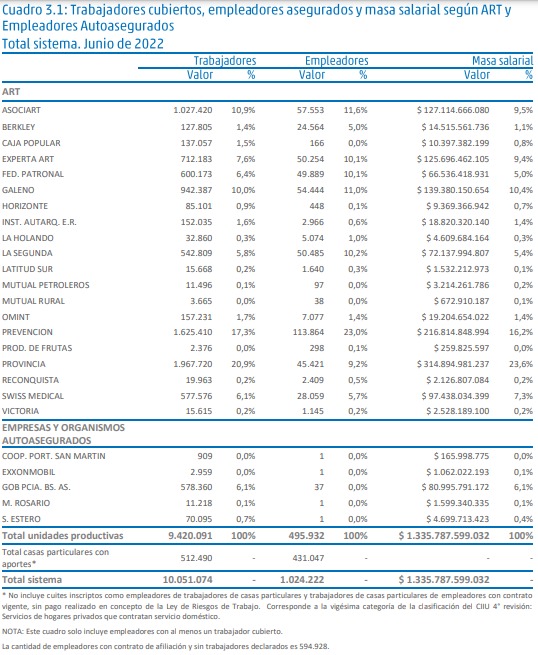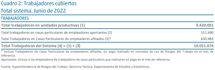 En Junio de 2022, el Sistema de Riesgos del Trabajo registraba un total de 1.619.150 empleadores asegurados con al menos un trabajador declarado. Dicha cifra es un 0,28 % superior al registrado en el mes de Mayo de 2022. A su vez, el Sistema cubría un total de 10.051.074 trabajadores (un 0,39 % superior al mes pasado), de los cuáles 9.420.091 desarrollaban sus tareas en unidades productivas, (+0,39 %) y 630.983 en casas particulares (+0,4 %) (DPEN 467/2014 / Resolución SRT 2224/14) (-0,1 %) .Por unidades productivas se entiende a entidades, empresas u organismos públicos o privados, que reúnen a uno o más trabajadores, y que producen bienes o servicios.