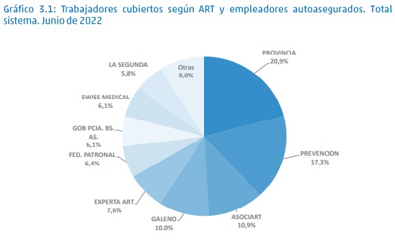 El ranking de aseguradoras por cantidad de trabajadores cubiertos es liderado por PROVINCIA con 1.967.720 ( 20,9 % de participación) seguida por PREVENCION con 1.625.410 trabajadores asegurados (17,3 % de participación y completan del 3º al 5to puesto: ASOCIART 1.027.420 Y 10,9 % de participación, GALENO ( 942.387 Y 10 %) y EXPERTA (712.183 y 7,6 %)