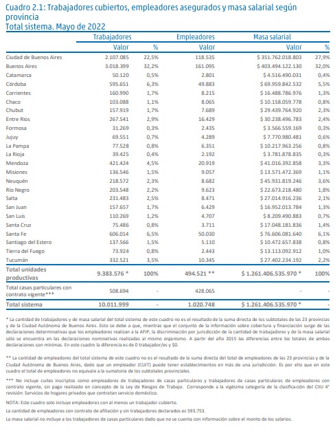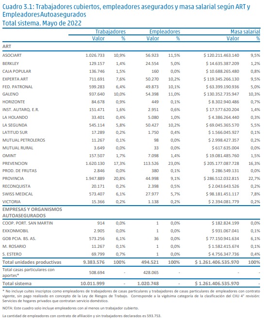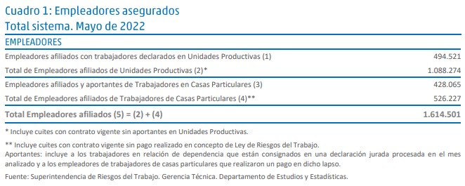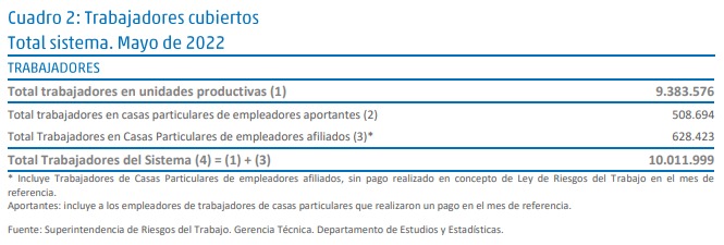 En Mayo de 2022, el Sistema de Riesgos del Trabajo registraba un total de 1.614.501 empleadores asegurados con al menos un trabajador declarado. Dicha cifra es un 0,54 % superior al registrado en el mes de Abril de 2022. A su vez, el Sistema cubría un total de 10.011.999 trabajadores (un 0,47 % inferior al mes pasado), de los cuáles 9.383.576 desarrollaban sus tareas en unidades productivas, (-0,50 %) y 628.423 en casas particulares (-0,1 %) (DPEN 467/2014 / Resolución SRT 2224/14) (-0,1 %) .Por unidades productivas se entiende a entidades, empresas u organismos públicos o privados, que reúnen a uno o más trabajadores, y que producen bienes o servicios.