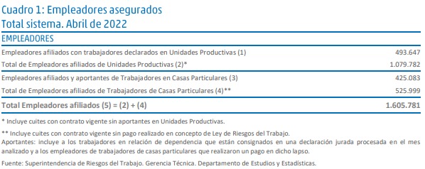 En Abril de 2022, el Sistema de Riesgos del Trabajo registraba un total de 1.605.781 empleadores asegurados con al menos un trabajador declarado. Dicha cifra es un 0,43 % superior a la registrada en el mes de Marzo de 2022