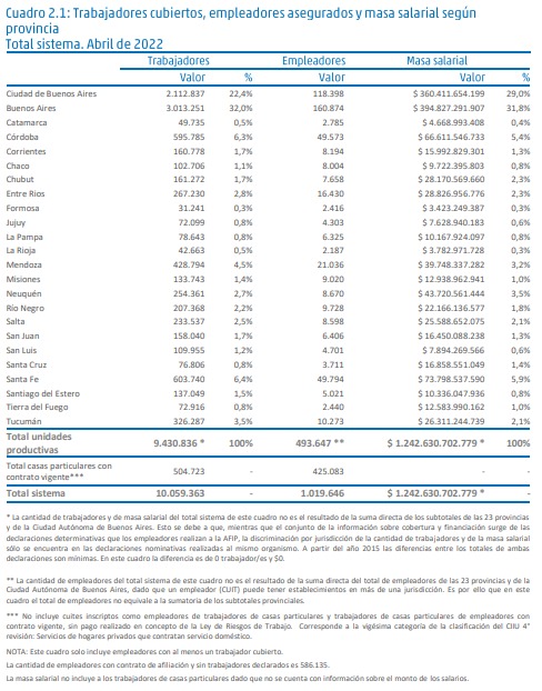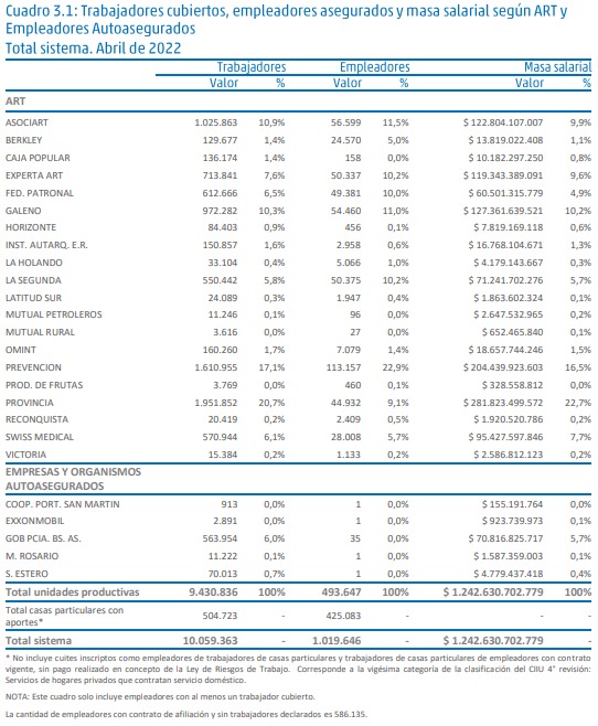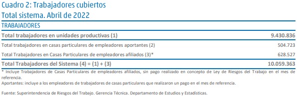 En Abril de 2022, el Sistema de Riesgos del Trabajo registraba un total de 1.605.781 empleadores asegurados con al menos un trabajador declarado. Dicha cifra es un 0,43 % superior a la registrada en el mes de Marzo de 2022. A su vez, el Sistema cubría un total de 10.059.363 trabajadores (un 0,87 % supeior al mes paado), de los cuáles 9.430.836 desarrollaban sus tareas en unidades productivas, (+0,91 %) y 628.527 en casas particulares (DPEN 467/2014 / Resolución SRT 2224/14).(+ 0,20 %) Por unidades productivas se entiende a entidades, empresas u organismos públicos o privados, que reúnen a uno o más trabajadores, y que producen bienes o servicios.