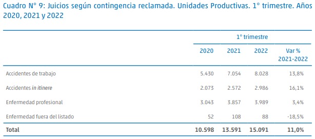 En lo que respecta a cantidad de juicios por tipo de contingencia reclamada, los accidentes de trabajo totalizaron 8.028 casos, un 13,8 % mas que en el mismo trimestre de 2021, el accidente in itinere 2.986 casos (+16,1 %), enfermedades profesionales 3.989 (+3,4 %) y las enfermedades fuera del listado (- 18,5 %).
