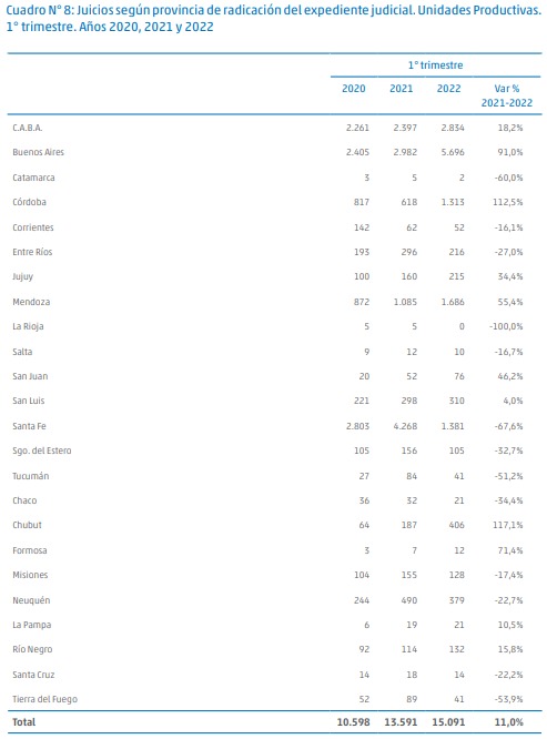 El mismo da cuenta que en dicho periodo se registraron 15.396 nuevos expedientes judiciales: 15.091 fueron juicios iniciados por trabajadores de unidades productivas y 305 fueron litigios de trabajadoras y trabajadores de casas particulares.