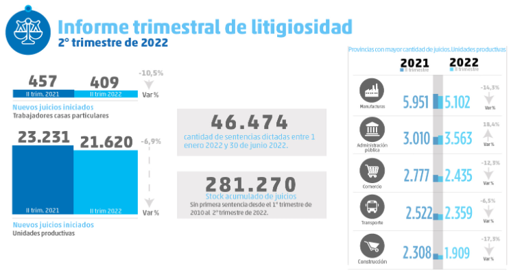 La Superintendencia de Riesgos del Trabajo (SRT) publicó el INFORME TRIMESTRAL DE LITIGIOSIDAD correspondiente al 2do. Trimestre de 2022. El mismo revela que en el período considerado se acumuló un total de 22.029 nuevos expedientes judiciales: 21.620 fueron juicios iniciados por trabajadoras y trabajadores de unidades productivas y 409 fueron litigios de trabajadoras y trabajadores de casas particulares. En comparación con el mismo trimestre de 2021, hubo una disminución en la cantidad de juicios iniciados (6,9% menor para el personal de unidades productivas y 10,5% menor para quienes trabajan en casas particulares).