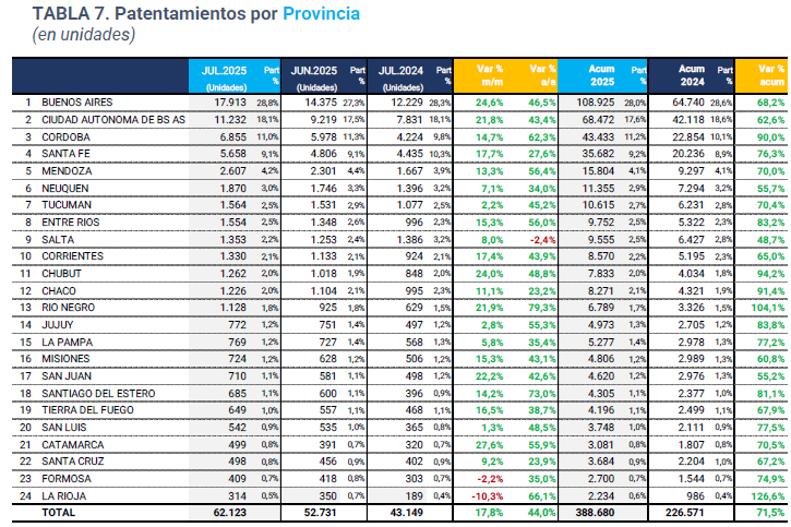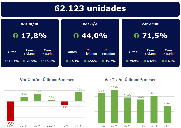 Durante el mes de julio se patentaron 62.123 vehículos, 17,8% más que en junio y 44,0% más que en julio 2024. Así, los primeros siete meses del año acumulan 388.680 vehículos 0km patentados, lo que equivale a un crecimiento del 71,5% respecto de 2024.