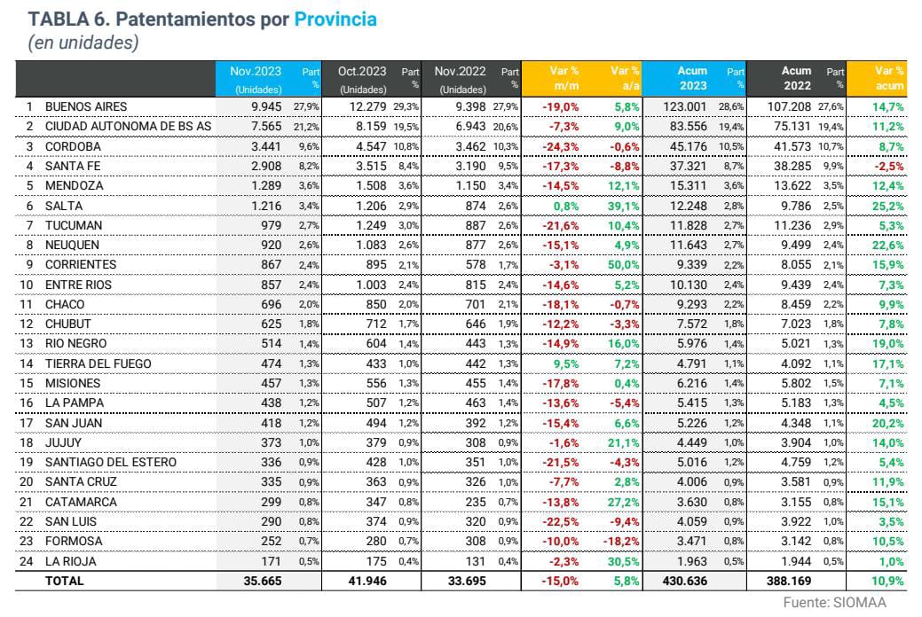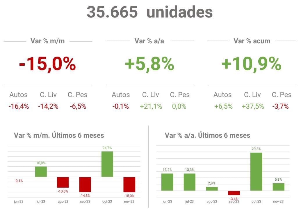 Durante el mes de noviembre se patentaron 35.665 vehículos, 15,0% menos que en octubre y 5,8% más que noviembre 2022. Al cierre de los 11 meses, los patentamientos suman 430.636 unidades, 10,9% más que en el mismo período del año pasado.