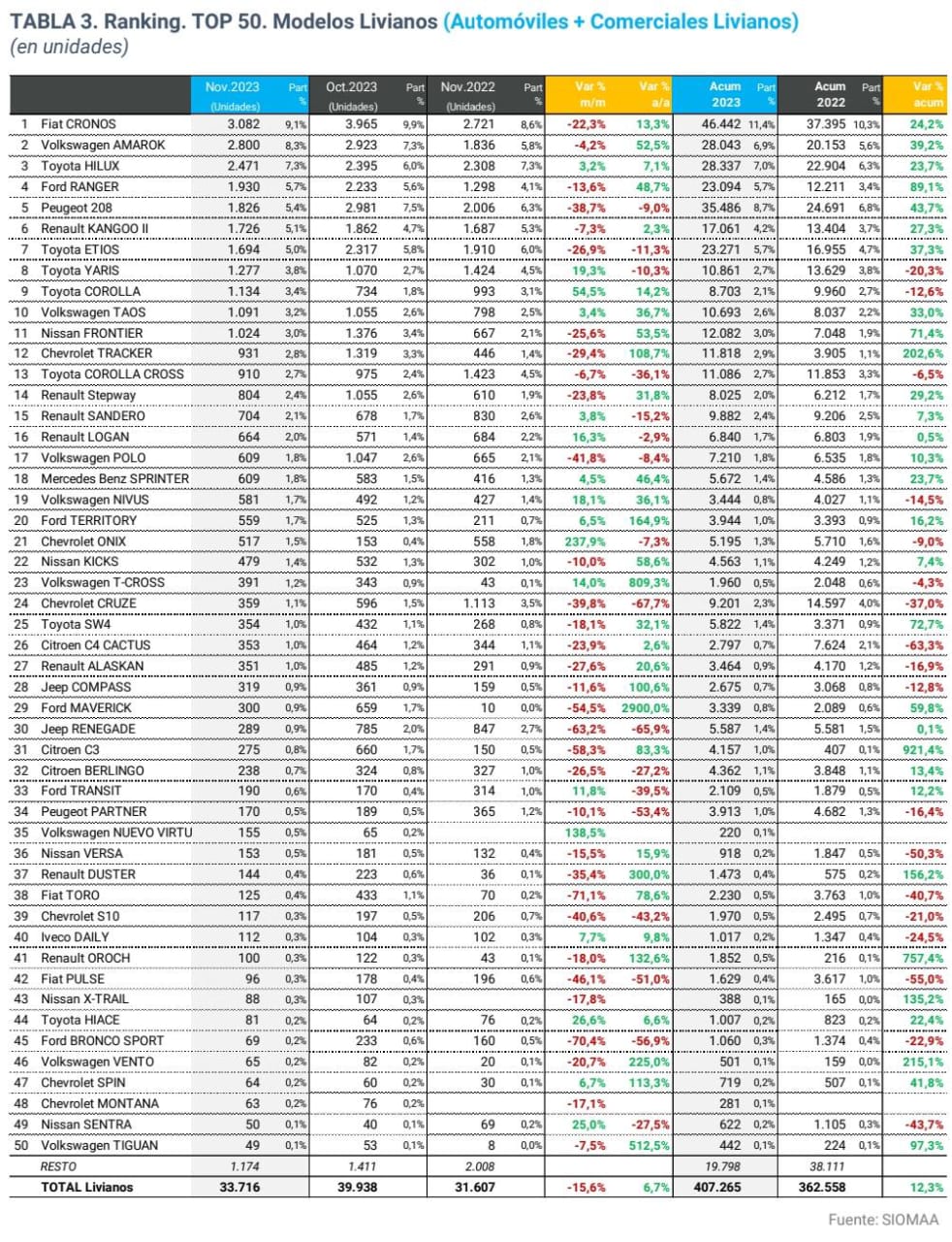 En noviembre todo se mantuvo igual en el primer puesto. El FIAT CRONOS, con 3.082 unidades vendidas sigue ocupando el primer puesto en ventas. El segundo lugar lo ocupó la VOLKSWAGEN AMAROK, 2.800 unidades vendidas y completa el podio la TOYOTA HILUX que con 2.471 unidades desplazó a la FORD RANGER con 1.930 vehículos al cuarto puesto. quedando en el quinto lugar el PEUGEOT 208 con 1.826 vehículos patentados.