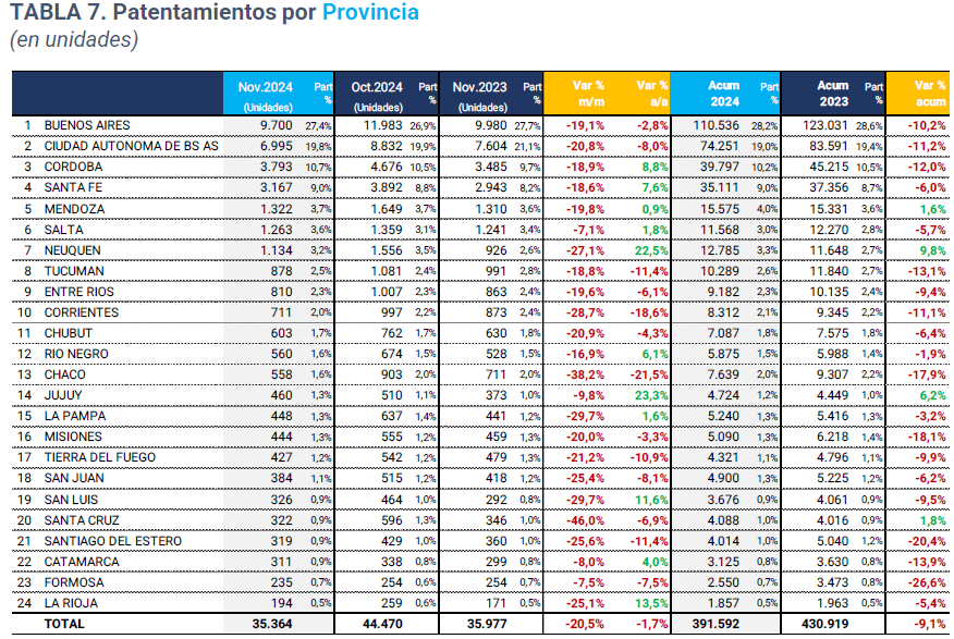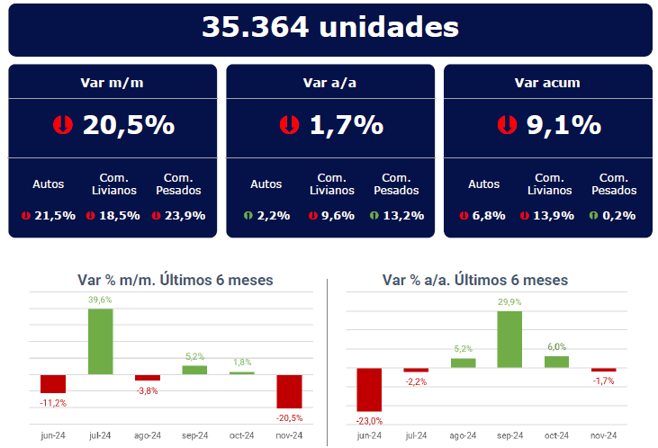 Durante el mes de noviembre se patentaron 35.364 vehículos, 20,5% menos que en octubre y 1,7% menos también que en noviembre 2023. En el acumulado de los once meses del año, se patentaron 391.592 unidades, 9,1% menos que en el mismo período 2023.