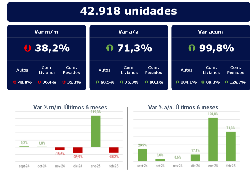 Durante el mes de febrero se patentaron 42.918 vehículos, 38,2% menos que en enero y 71,3% más que en febrero 2024.