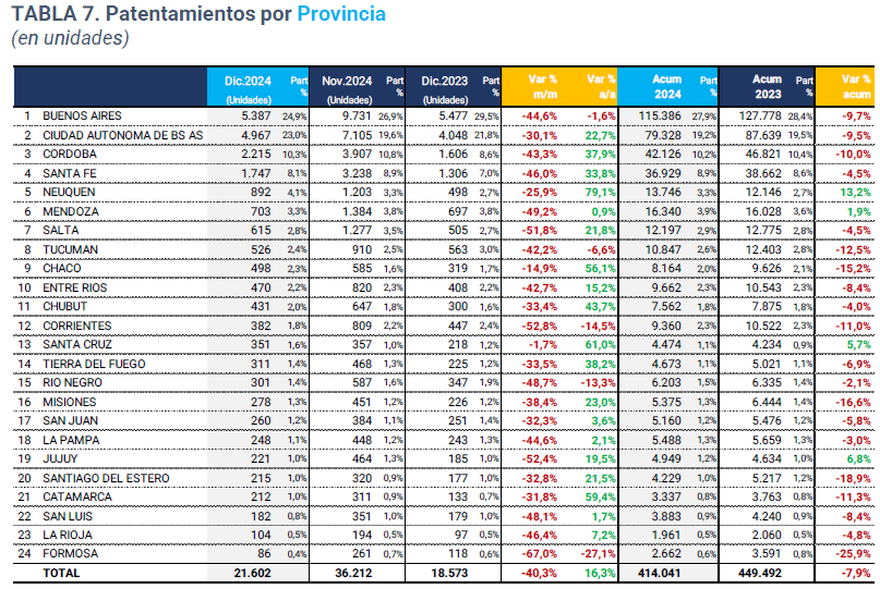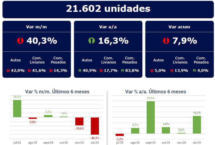 Durante el mes de diciembre se patentaron 21.602 vehículos, 40,3% menos que en noviembre y 16,3% más que en diciembre 2023. Con el dato del último mes del año, durante 2024 se patentaron 414.041 unidades, 7,9% menos que en 2023.
