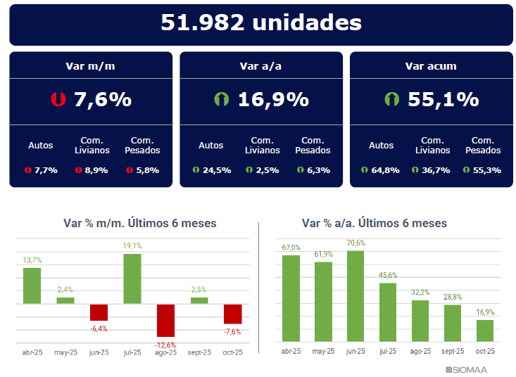 Durante el mes de octubre se patentaron 51.982 vehículos, 7,6% menos que en septiembre y 16,9% más que en octubre 2024. Así, los primeros diez meses del año acumulan 552.484 vehículos 0km patentados, lo que equivale a un crecimiento del 55,1% respecto de 2024.