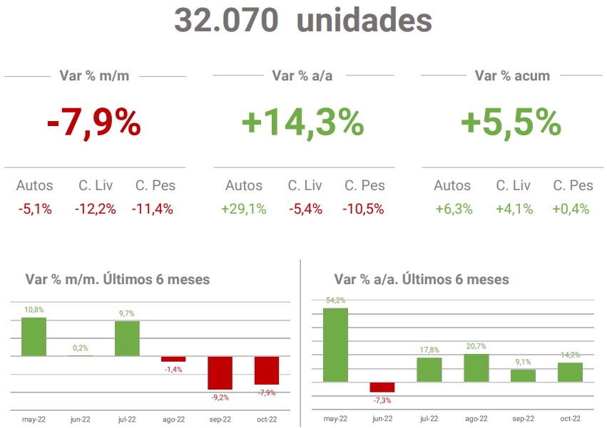 En los diez meses acumulados del año se patentaron 353.834 unidades, un 5,5 % más que en el mismo período de 2021, en el que se habían registrado 335.238 vehículos.