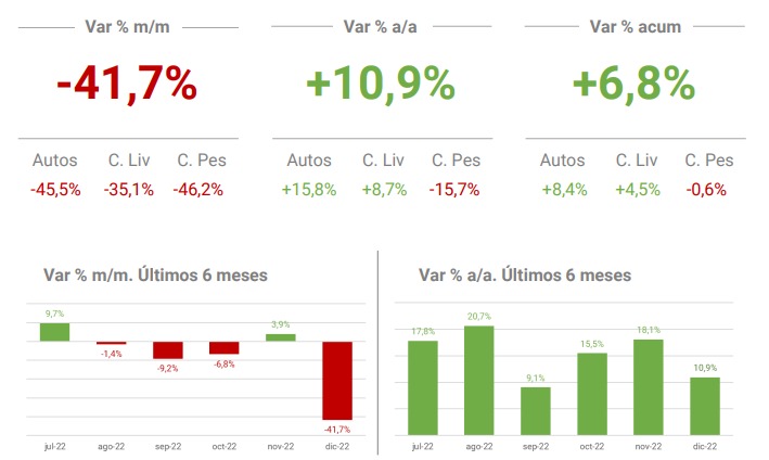 La Asociación de Concesionarios de Automotores de la República Argentina (ACARA) informó que el número de vehículos patentados durante diciembre de 2022 ascendió a 19.635 unidades, lo que representa una caída del 41,7 % con respecto a noviembre, aunque la variación interanual es de un 10,9 % superior.