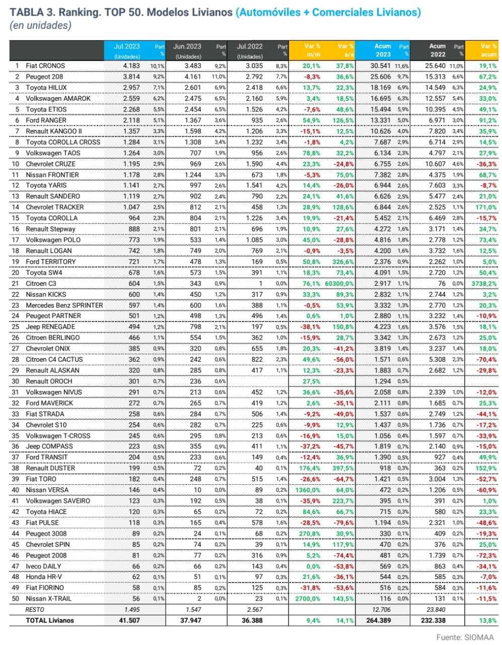 En julio todo volvió a la normalidad. El FIAT CRONOS, con 4183 unidades vendidas volvió a ocupar el primer puesto en ventas, desplazando al PEUGEOT 208, con 3.814 vehículos vendidos al segundo lugar. El tercer lugar volvió a quedar en manos de la TOYOTA HILUX con 2.957 unidades comercializadas. Sí hubo cambios en el cuarto lugar, al cual accedió la VOLKSWAGEN AMAROK CON 2.559 vehículos vendidos. El TOYOTA ETIOS, 2.268 unidades, cayó de esta manera al quinto lugar.