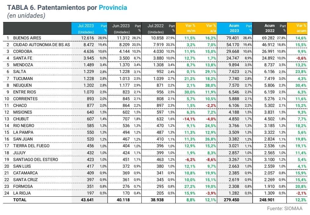 La provincia de Buenos Aires, con 12.616 patentamientos lidera el ranking, seguida por la Ciudad Autónoma de Buenos Aires con 8.472 y Córdoba completa el podio con 4.636 vehículos.