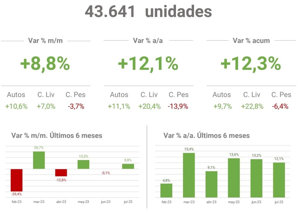 Durante el mes de julio se patentaron 43.641 vehículos, 8,8% más que en junio y 12,1% más que en julio 2022. Al cierre de los primeros siete meses, los patentamientos suman 279.450 unidades, 12,3% más que en el mismo período del año pasado.
