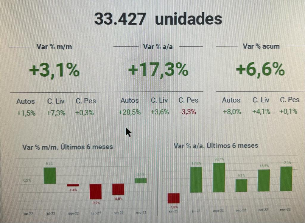 El número de vehículos patentados durante noviembre de 2022 ascendió a 33.427 unidades, lo que representa un incremento del 3,1 % con respecto a setiembre, cuando se habían patentado 32.070 vehículos. La variación interanual crece un 17,3 %.