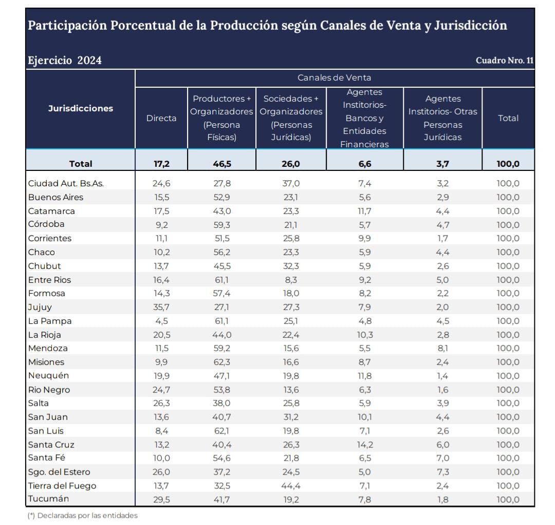 De la misma surge que de los cuatro canales de venta, sobre la producción total del mercado asegurador, los Productores Asesores de Seguros alcanzan el 46,4% de la misma, las Sociedades de Productores el 26%, la Venta Directa 17,3% y los Agentes Institorios 10,3%.