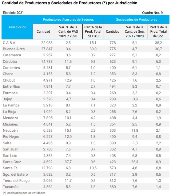 El Cuadro Nº 9 muestra la cantidad de Productores Asesores de Seguros y Sociedades de Productores de Seguros según las jurisdicciones geográficas. El 52,6% del total de Productores Asesores del registro (43.692) realizan operaciones comerciales en C.A.B.A y el 63,7% en la Provincia de Buenos Aires, mientras que el 92,7% de las Sociedades de Productores (839) lo hacen en C.A.B.A. y el 92,3% en la Provincia de Buenos Aires.
