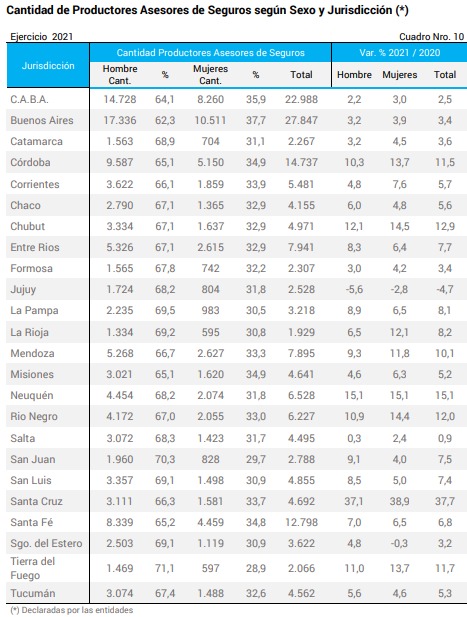 El Cuadro Nº 10 indica el número de Productores Asesores de Seguros clasificados según sexo y jurisdicción en las cuales operan. Si bien en promedio alrededor del 67% de los Productores Asesores son hombres, es importante destacar que el crecimiento de la presencia femenina en el sector fue superior en mayor cantidad de jurisdicciones al crecimiento masculino. La jurisdicción con mayor presencia de la mujer es la Provincia de Buenos Aires (37,7%), seguida por C.A.B.A. (35,9%).