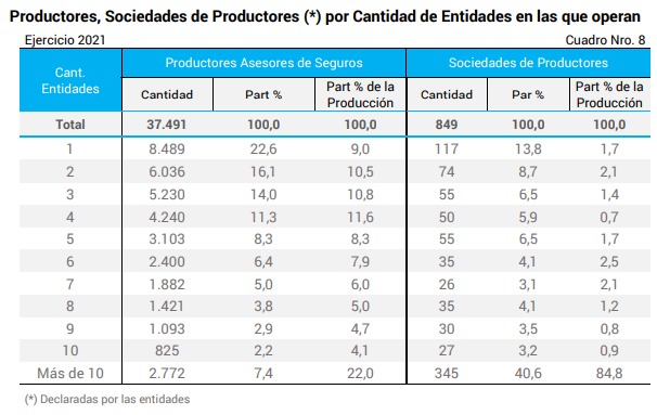 El Cuadro Nº 8 exhibe un detalle de la proporción de Productores Asesores de Seguros y Sociedades de Productores de Seguros según la cantidad de entidades con las cuales mantienen un vínculo comercial. El 22,6% son Productores Asesores exclusivos de una entidad, y solo acumulan el 9% de la Producción del mercado, mientras que el 72,3% de los mismos tienen relación hasta con 5 entidades, comercializando el 50,2% de las primas emitidas. En el caso de las Sociedades de Productores el 40,6% operan con más de 10 entidades aseguradoras y concentran el 84,8% de la producción.