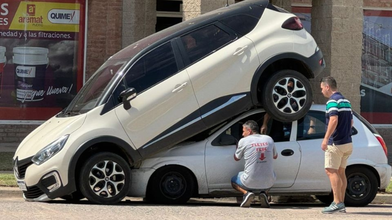 Dos automóviles protagonizaron un inusual choque, que terminó con uno de los vehículos encima del otro.