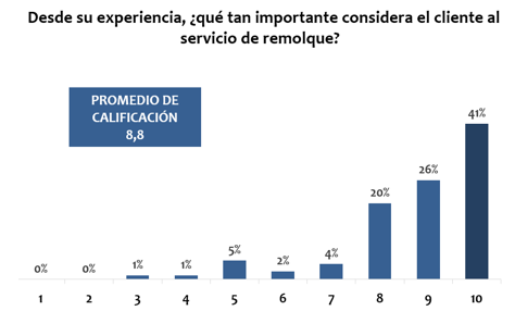 El servicio de remolque es considerado fundamental por los productores, con casi el 90% calificándolo entre los 8 y los 10 puntos. Sin embargo, la evaluación del servicio actual ofrecido por las compañías es poco satisfactoria, con un promedio de 4,4 puntos y predominando calificaciones por debajo de 6.