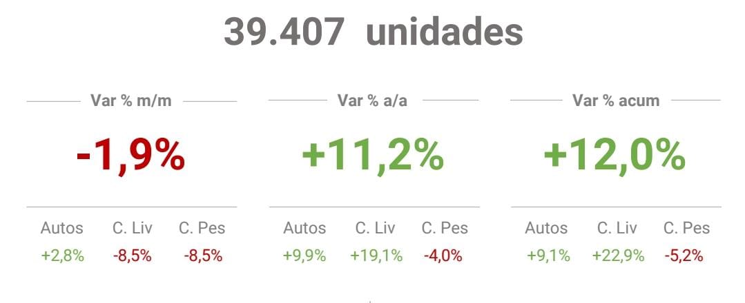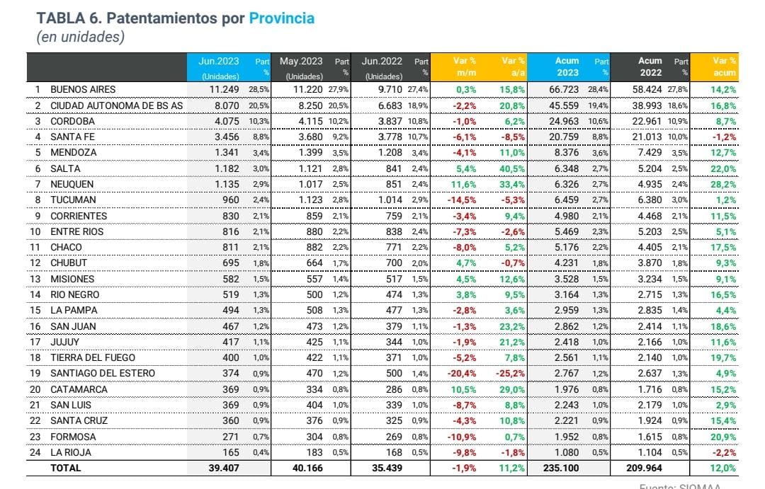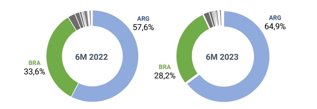 En lo que respecta al origen de las unidades 0 Km. sigue predominando aquellos vehículos de fabricación nacional, con un 64,9 % de participación contra un 28,2 % de unidades importadas de Brasil. En 2022 para los mismos primeros 6 meses del año la participación era del 57,6 % y 33,6 % respectivamente.
