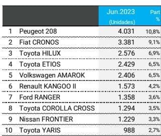 En junio hubo sorpresas en el podio, ya que el PEUGEOT 208, con 4.031 unidades vendidas desplazó al FIAT CRONOS de cuyo modelo solo se vendieron 3.381 vehículos. También hubo cambios en el tercer puesto al que accedió la TOYOTA HILUX con 2.576 unidades comercializadas. En cuarto lugar quedo el TOYOTA ETIOS, 2429 unidades, cayendo al quinto lugar la VOLKSWAGEN AMAROK con 2.406.