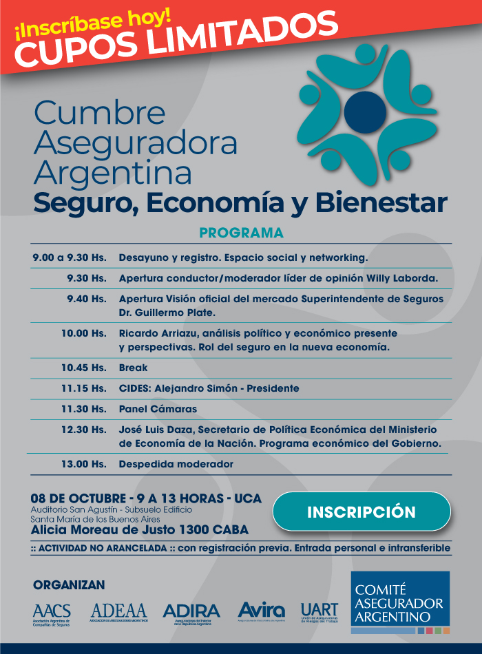 El Comité Asegurador Argentino, se complace en anunciar, la Cumbre que tendrá lugar el próximo 8 de octubre, entre 9 y 13 hs, en el auditorio San Agustín de la UCA.