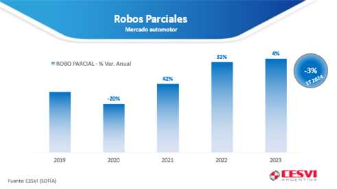 Los informes presentados por CESVI muestran también que hubo una desaceleración de los robos parciales, aunque esto no implica una reducción de casos. “En lo que respecta a los robos parciales, que en su gran mayoría son robos de ruedas, se observa un gran incremento interanual en los primeros años de la pandemia, mientras que en el 2023 y en el primer trimestre del 2024, se evidencia una notable desaceleración en el crecimiento.”, señaló Aiello.