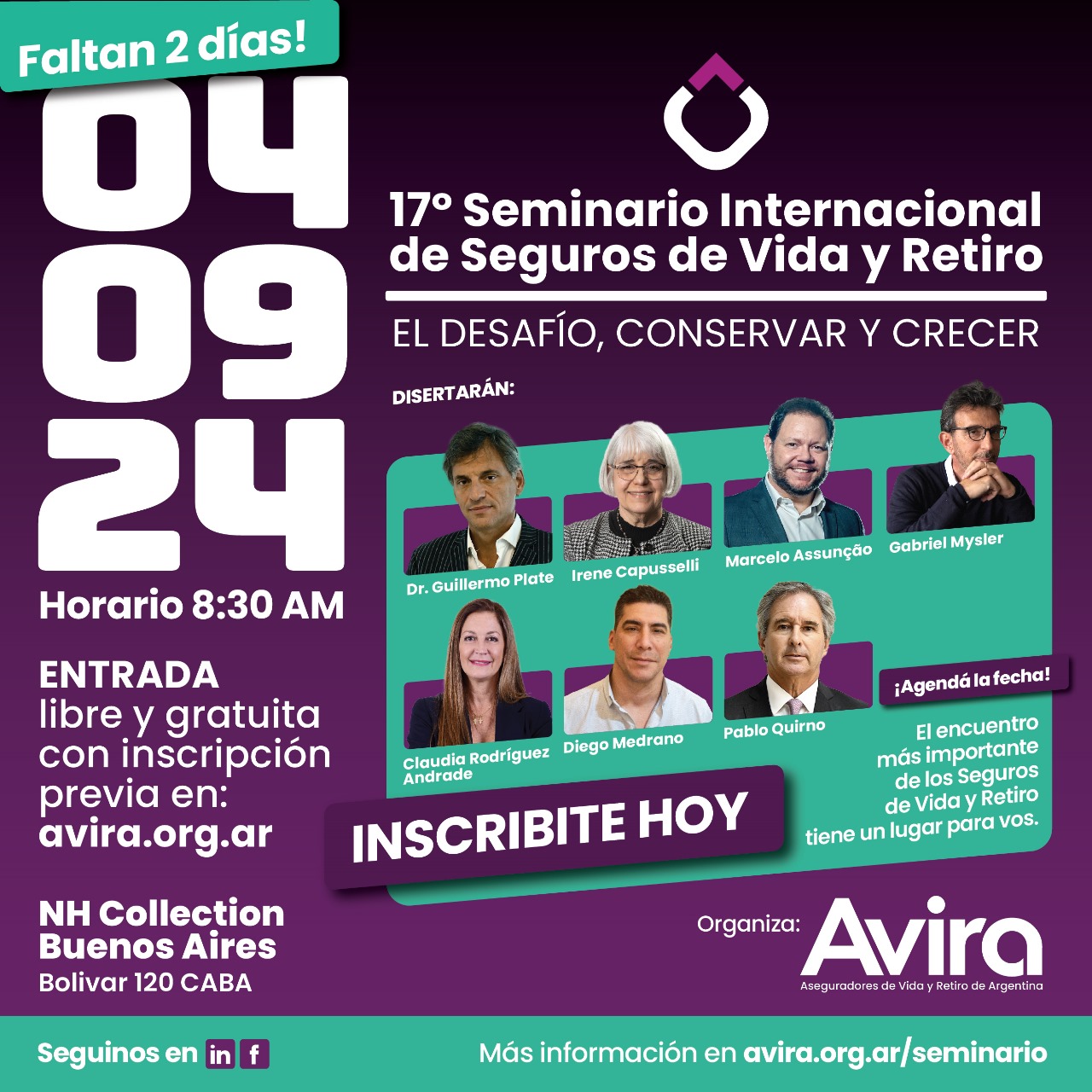 Avira anuncia la participación del Lic. Pablo Quirno, Secretario de Finanzas del Ministerio de Economía de la Nación, en el 17° Seminario Internacional de Seguros de Vida y Retiro el próximo miércoles 4 de septiembre en el hotel NH Collection Buenos Aires Centro Histórico (Bolívar 120, Salón Gaudí, Piso 4to).