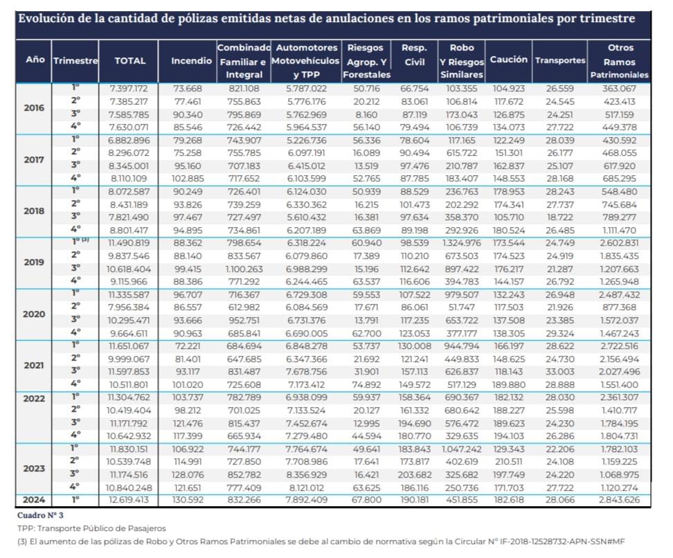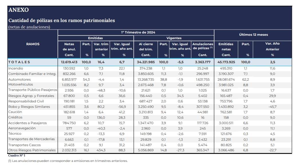 La Superintendencia de Seguros de la Nación, a través de la Circular Informativa IF-2024-106961928-APN-GEYE#SSN de fecha 1/10/2024 brindó al mercado la Información Estadística de Pólizas y Cantidad de Siniestros correspondientes al 1er Trimestre 2024.